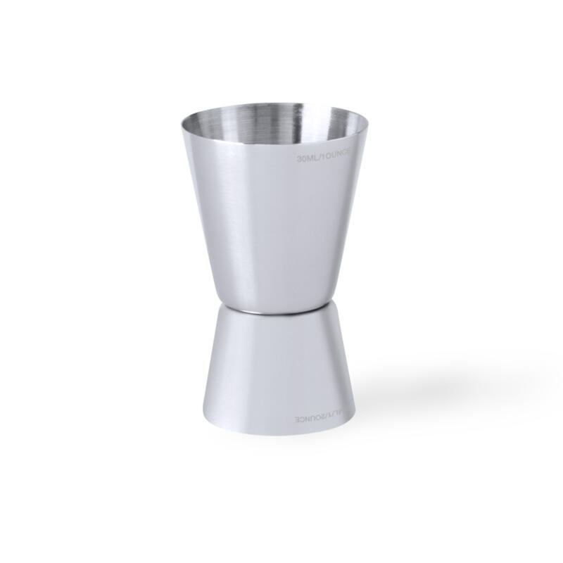 Medidor de bebidas en acero inox de acabado mate. Diseñado especialmente para marcaje en láser y presentado en caja de PVC.