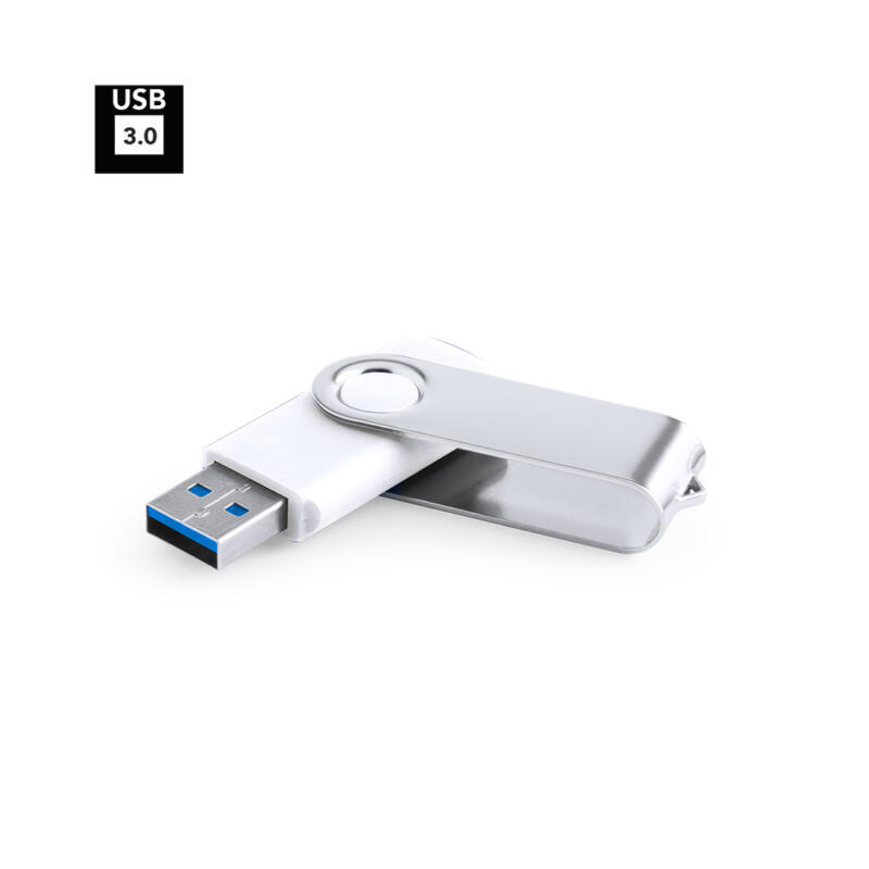 Memoria USB 3.0 de 16GB de capacidad. Con clip metálico y cuerpo de suave acabado en color blanco. Presentada en estuche individual.