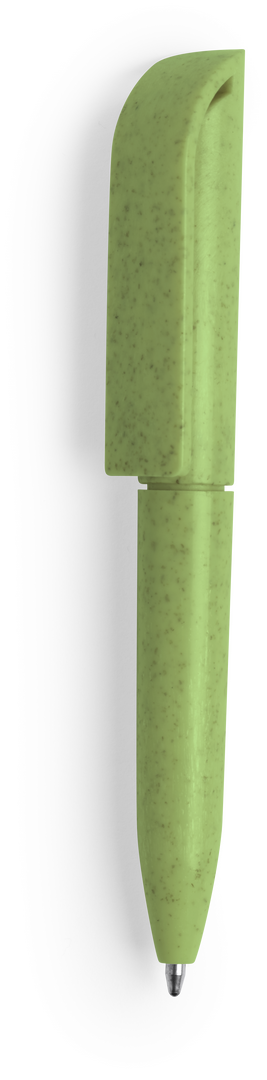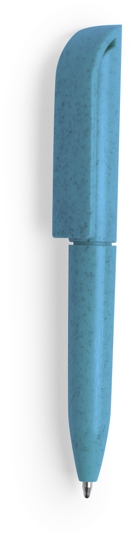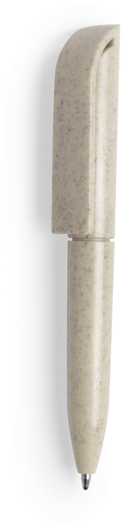 Minibolígrafo con mecanismo giratorio de línea nature. Cuerpo y accesorios en caña de trigo, para así fomentar la utilización de materias primas naturales y reducir las emisiones contaminantes. Disponible en variada gama de colores y en tinta azul.