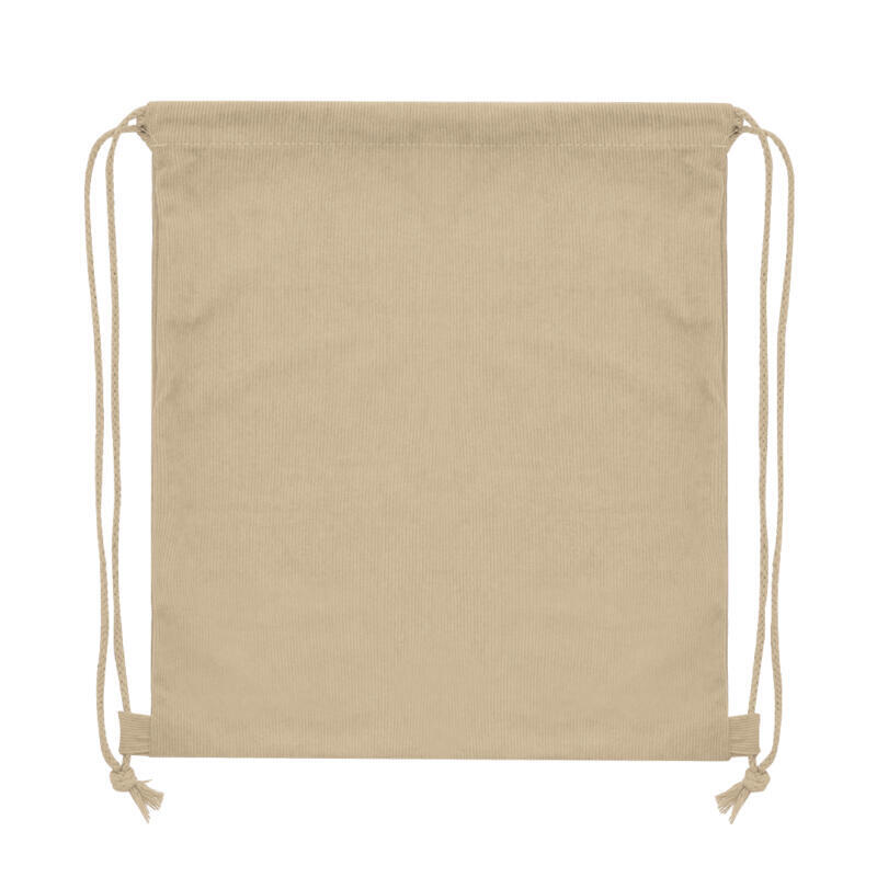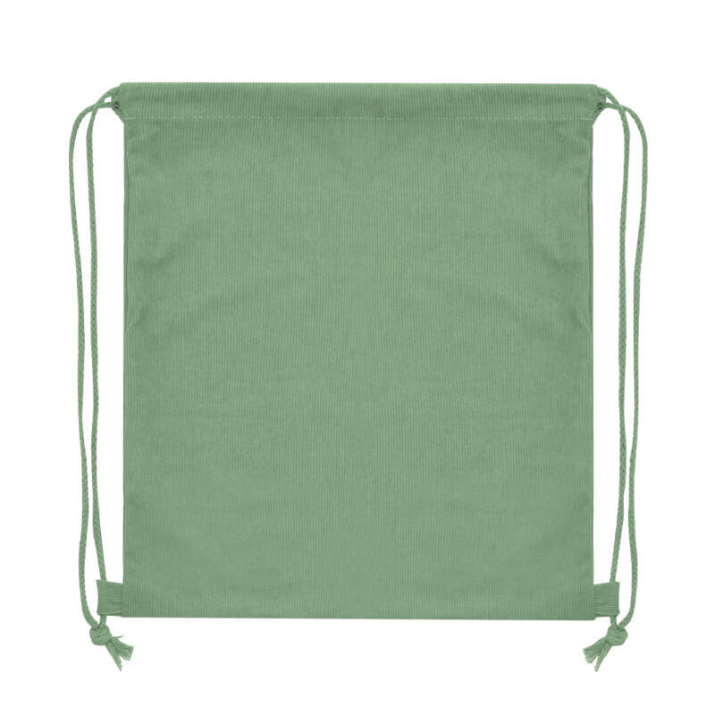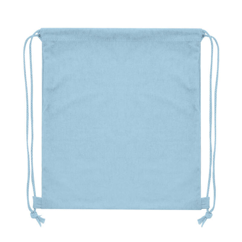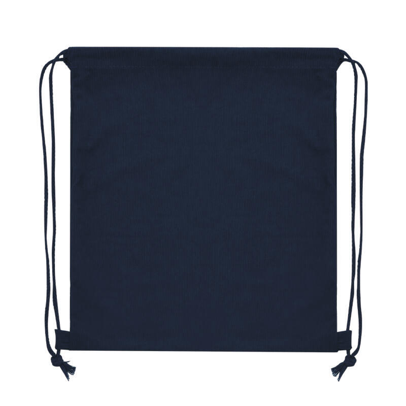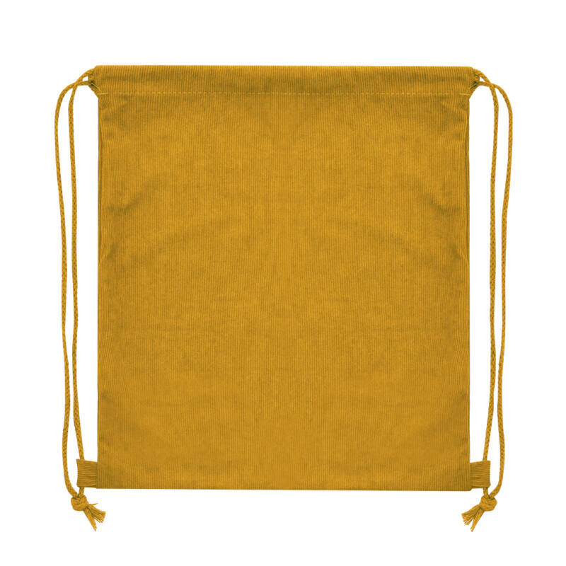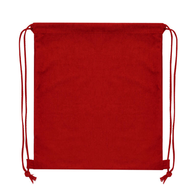 Mochila de cuerdas fabricada en resistente pana de poliéster. De acabado cosido, con cuerdas a juego y refuerzos laterales. Disponible en variada gama de colores.