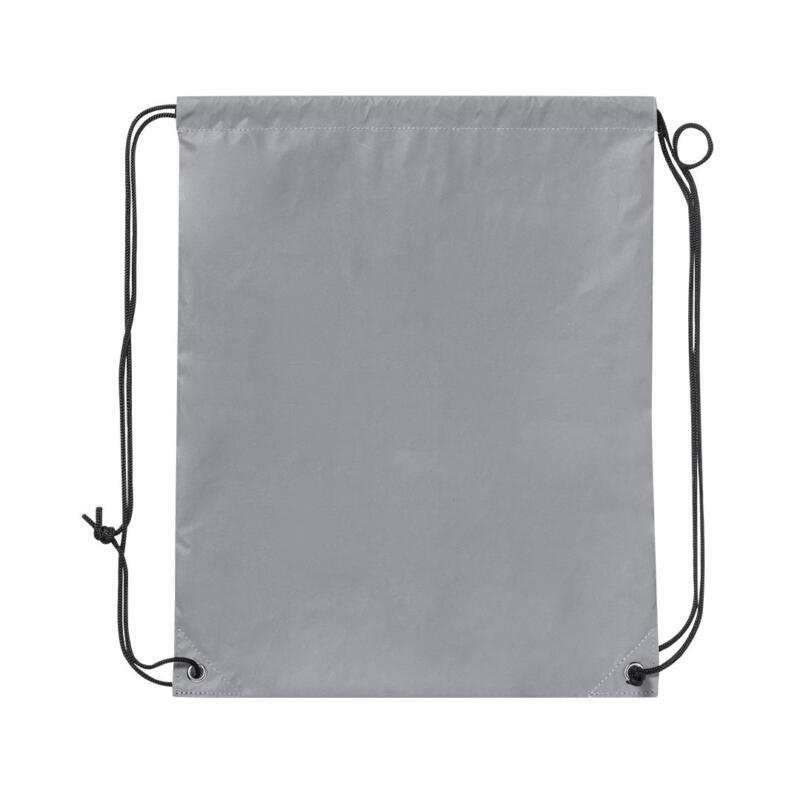 Mochila de cuerdas de suave poliéster 210T. Fabricada empleando tejido con gran capacidad para reflejar intensamente la luz, gracias a millones de pigmentos reflectantes y basándose en el principio de la retro-reflexión de la luz, una propiedad de visibilidad nocturna que consiste en la refracción de la luz hacia la fuente de origen de la misma. Con cuerdas autocierre en color negro y argollas metálicas. Resistencia hasta 7kg de peso y resistente al agua.