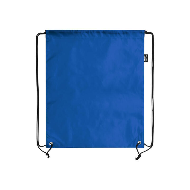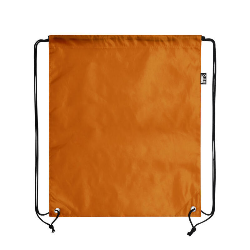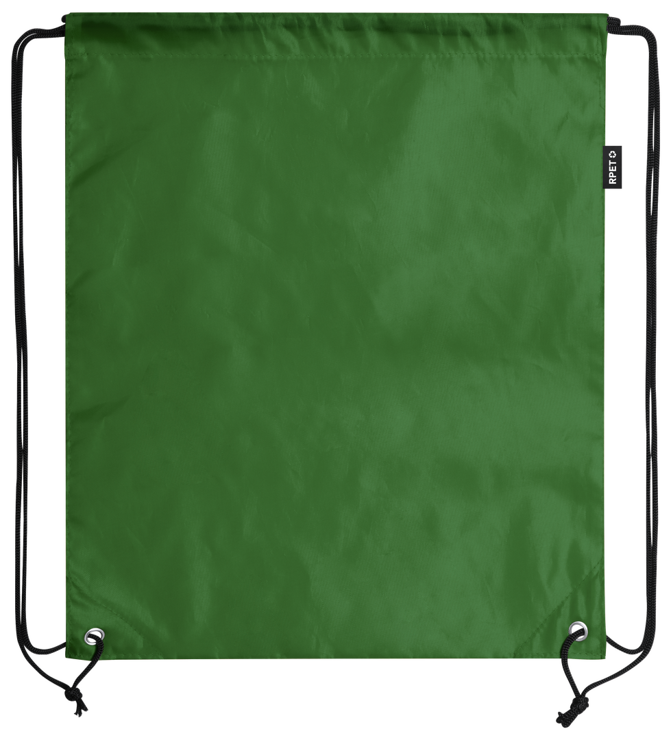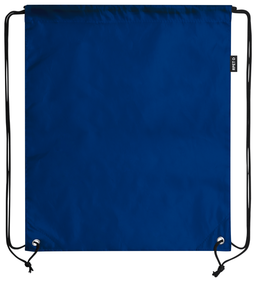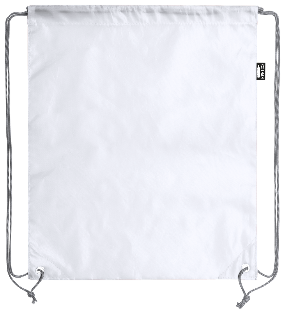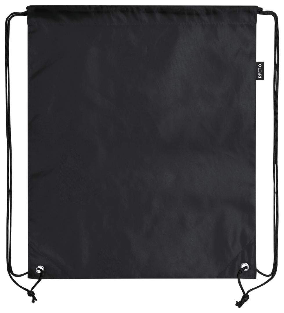 Mochila de cuerdas en suave poliéster RPET. Con cuerdas autocierre, esquinas reforzadas y resistentes argollas metálicas. Distintivo RPET en etiqueta lateral y disponible en variada gama de colores (color blanco especialmente fabricado para impresión en sublimación).Elaborado a partir de plástico reciclado, para así fomentar la reutilización de residuos plásticos y ayudar a la sostenibilidad del planeta.