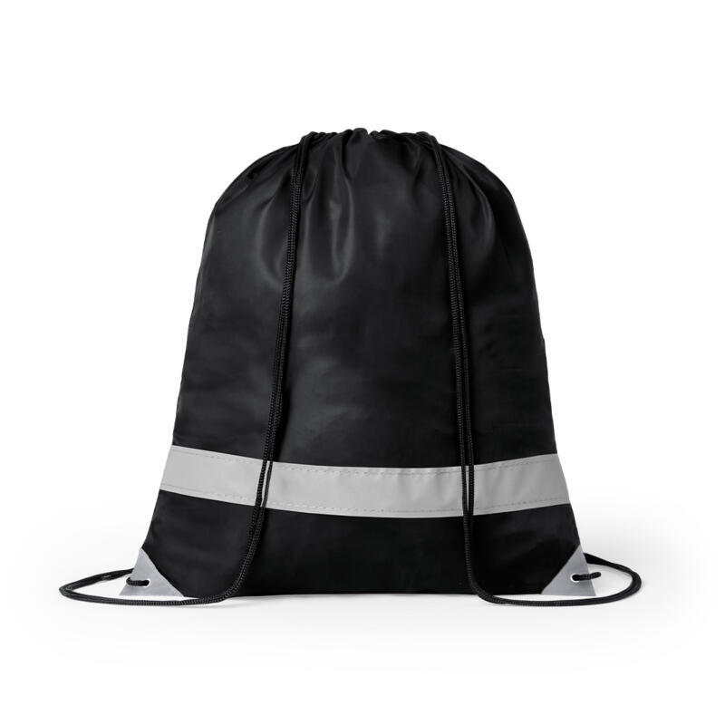 Mochila reflectante en suave poliéster 190T de alegres colores, con tira frontal reflectante. Cuerdas autocierre en color negro y esquinas reflectantes reforzadas con argollas metálicas.