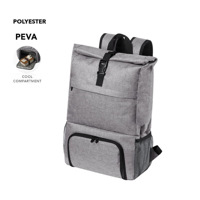 Mochila multiusos en resistente poliéster 600D de acabado denim. De diseño urbano, incluye compartimento isotérmico independiente con cobertura de PEVA para fiambrera. Compartimento principal con cierre de seguridad de hebilla y bolsillos laterales de redecilla. Con cintas de hombros acolchadas, de ajuste regulable.