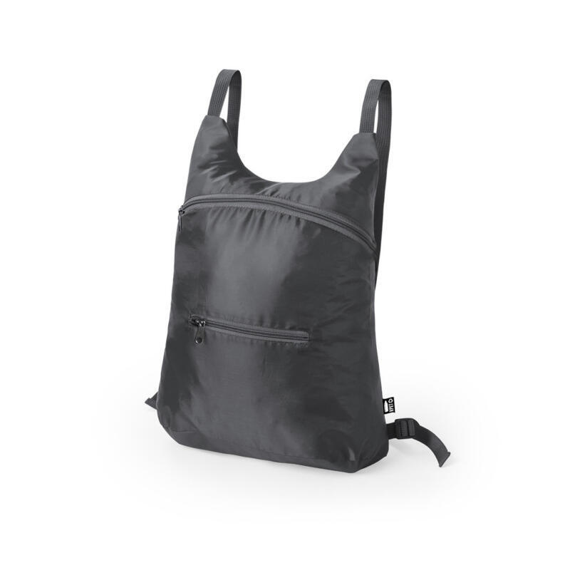 Mochila plegable en suave poliéster 201D RPET, elaborado a partir de plástico reciclado, para así fomentar la reutilización de residuos plásticos y ayudar a la sostenibilidad del planeta. Con cierre de cremallera y bolsillo frontal. Esquinas reforzadas, cintas de hombros regulables y accesorios en color gris. Plegado de pequeño tamaño, con cinta de transporte y disponible en variada gama de colores. Distintivo RPET en etiqueta.