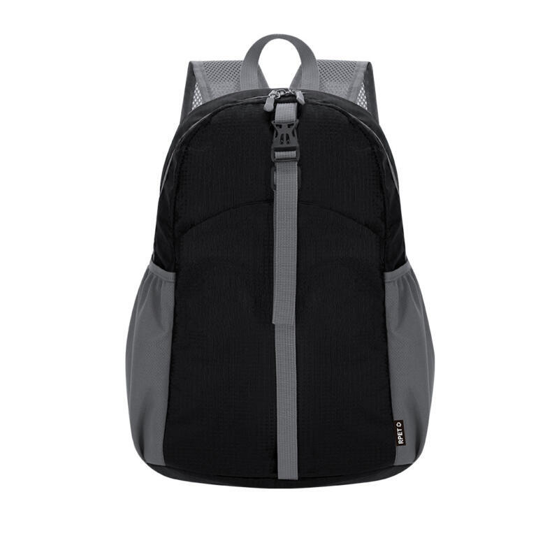 Mochila plegable en suave poliéster Ripstop RPET 210D. Bolsillo principal con cierre de doble tirador, bolsillo interior de doble función y bolsillo frontal con cierre de clip. Esquinas reforzadas con rejillas, cintas de hombros regulables y accesorios en color gris. Plegado de pequeño tamaño, con asa de transporte. Distintivo RPET en etiqueta.El material RPET se elabora a partir de plástico reciclado, para así fomentar la reutilización de residuos plásticos y ayudar a la sostenibilidad del planeta.