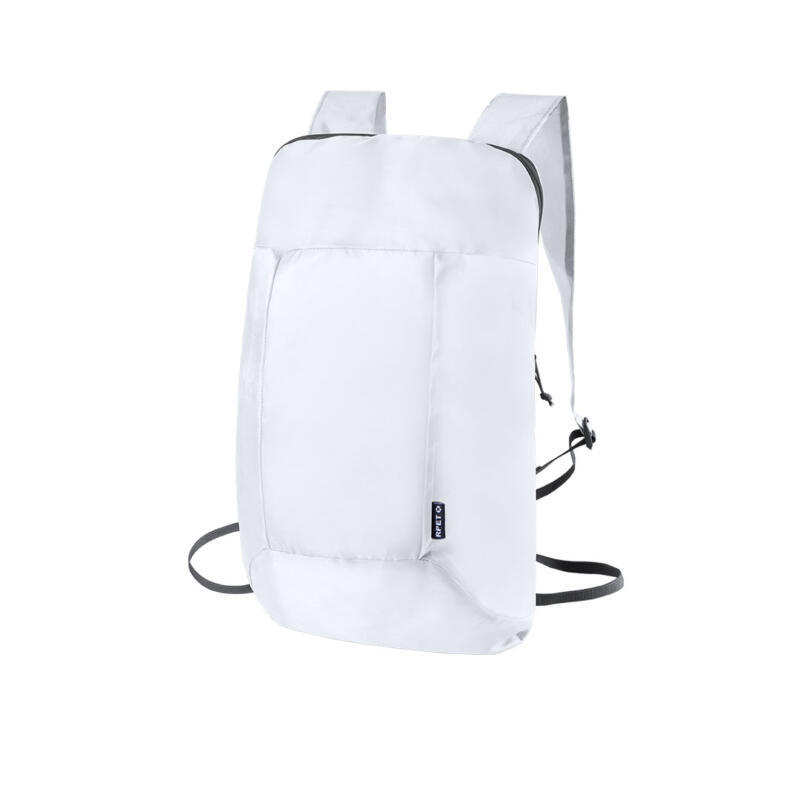 Mochila plegable en RPET 210D. Con cierre de cremallera, esquinas reforzadas, cintas de hombro regulables. Distintivo RPET en etiqueta exterior.El material RPET se elabora a partir de plástico reciclado, para así fomentar la reutilización de residuos plásticos y ayudar a la sostenibilidad del planeta.