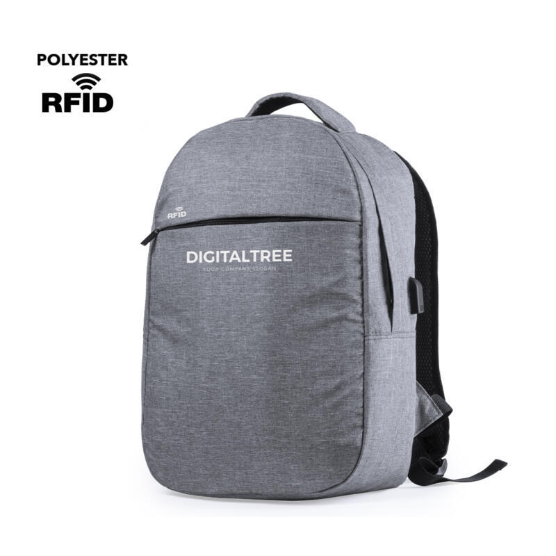Mochila de seguridad, con diseño urbano en resistente poliéster 300D. Bolsillo interior con protección de seguridad RFID (Identificación por Radio Frecuencia) que mantiene seguros los datos de la tarjeta y demás dispositivos. Compartimento principal con elegante tapeta en la cremallera. Con conexión USB -powerbank no incluido- y bolsillo interior acolchado para ordenador portátil de hasta 15 pulgadas. Parte trasera y cintas acolchadas.
