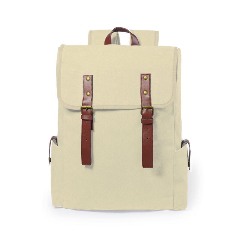 Mochila de diseño atemporal, fabricada en resistente canvas de 480g/m2, con cintas de cierre y asa de transporte en polipiel. Interior acolchado con compartimentos independientes para tablet de hasta 10 pulgadas y ordenador portátil de hasta 15 pulgadas. Con prácticos bolsillos laterales en el exterior, espalda acolchada y cintas para hombros ajustables y acolchadas.