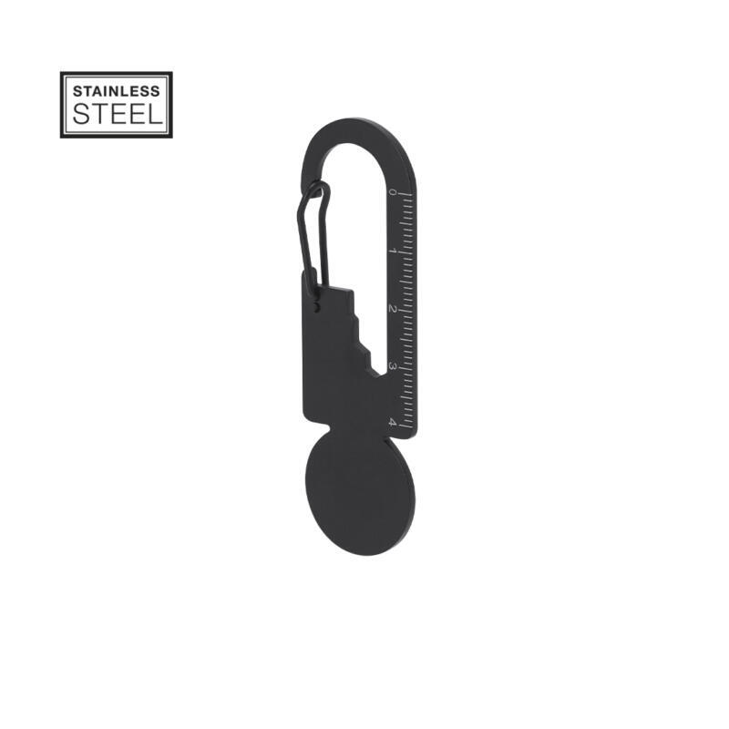 Multiherramienta de acero inoxidable y acabado negro mate. Diseñada para adaptarse a múltiples necesidades, incluye 8 funciones: llave para tuercas hexagonales en varios tamaños, regla para mediciones, abrebotellas, moneda para carro de compra, etc. Con cierre de mosquetón.