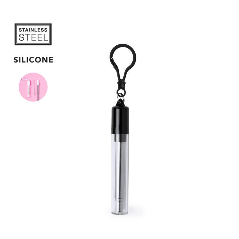 Pajita reutilizable y extensible en acero inoxidable, con boquilla de silicona. Con accesorio limpiador incluido y presentada en estuche transparente con accesorio para transporte.