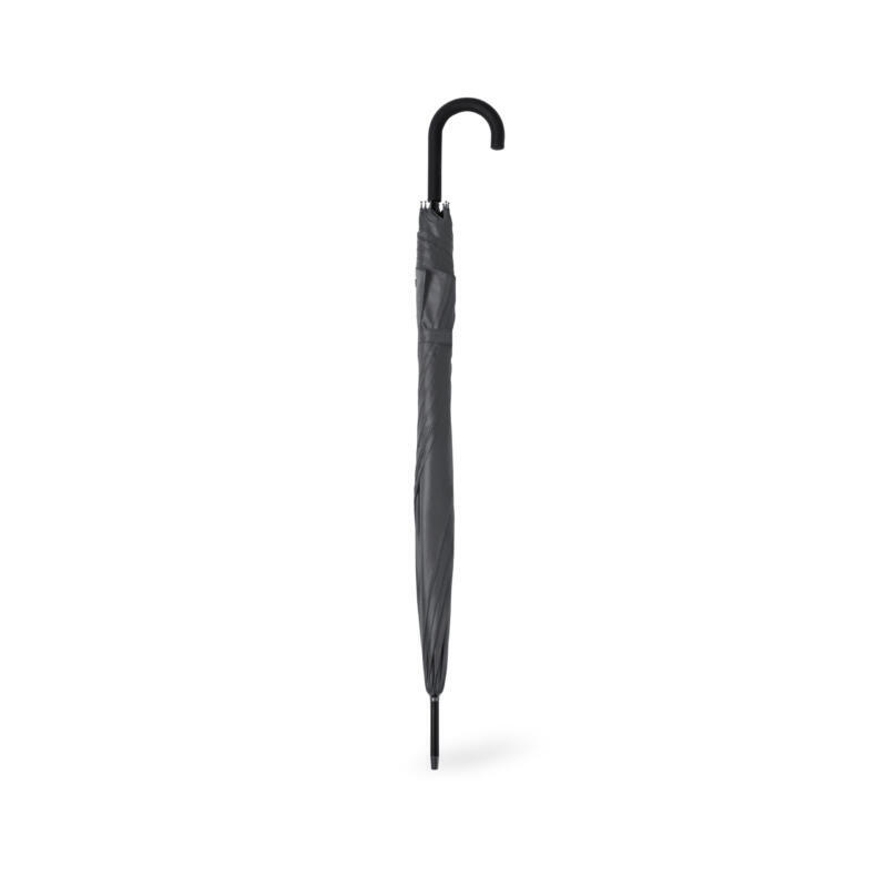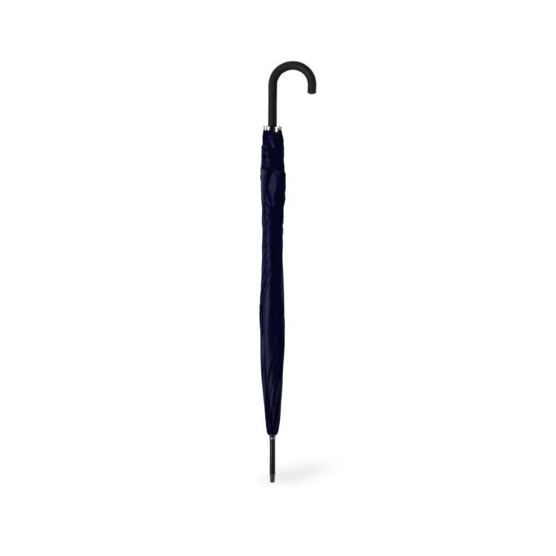 Paraguas de 8 paneles tamaño XL -130 cm diámetro-, fabricado en resistente material pongee 190T. De apertura automática y con mecanismo antiviento. Varillas de fibra en color negro, con mango curvado y cierre de velcro. Disponible en extensa gama de colores.