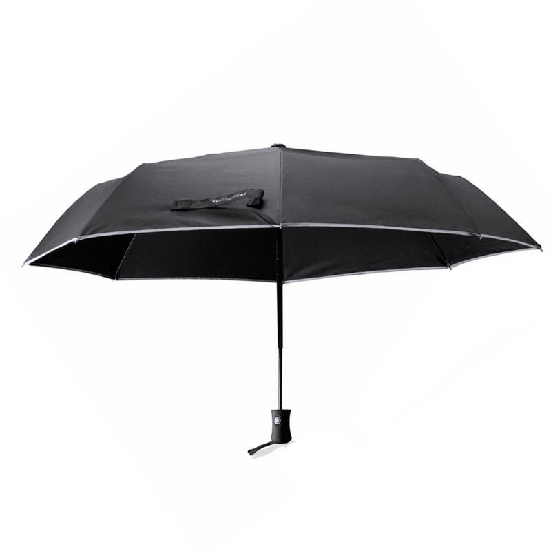 Paraguas plegable de Antonio Miró, de 8 paneles y elegante diseño en color negro con ribetes en color blanco. De 95cm de diámetro, con mecanismo automático de apertura y cierre, sistema antiviento y en resistente material pongee. Con varillas metálicas en color negro, cierre de velcro y mango ergonómico con cinta de transporte. Presentado en funda individual a juego con logotipo de la marca.