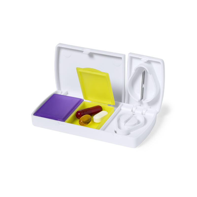 Pastillero en suave y resistente material acabado en color blanco. Con 2 cajitas interiores, cierre de seguridad y cuchilla para partir pastillas.