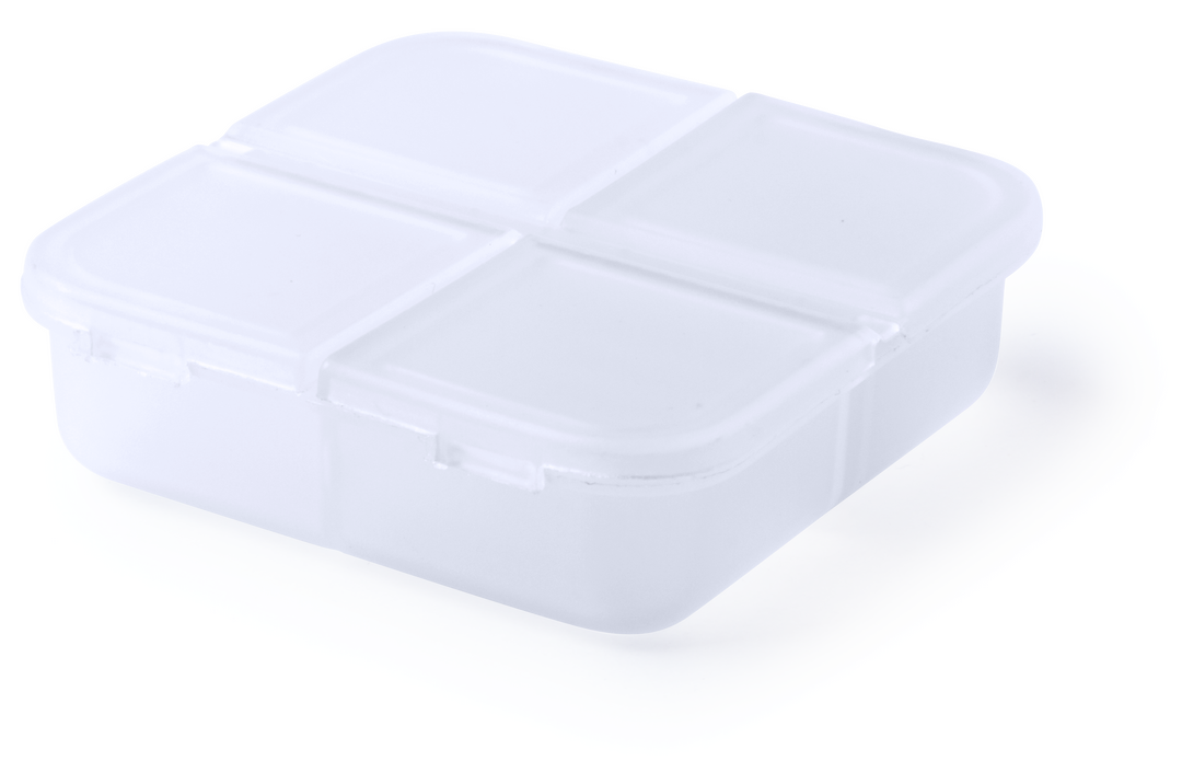 Pastillero de 4 compartimentos en material ABS de acabado translúcido y libre de BPA. Con tapa individual por compartimento.