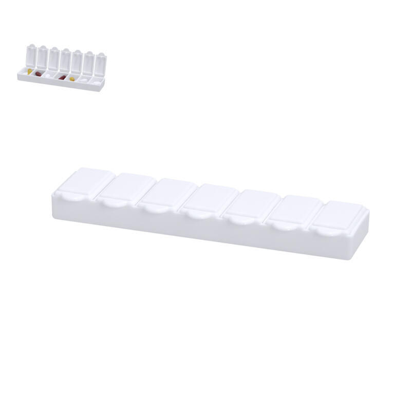 Pastillero semanal en resistente material PP de acabado blanco sólido. Incluye 7 compartimentos individuales con cierre de seguridad. Libre de BPA.