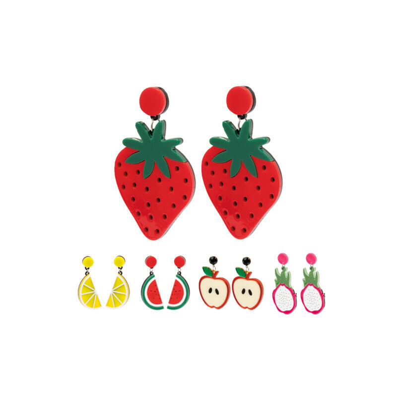 Fresca y original colección de pendientes frutales. Cautivadores y llenos de color, tienen forma de fresa, pitaya, manzana, sandía o limón, siendo una declaración de estilo. Fabricados con atención a los detalles y con cierre de clip. Presentados individualmente en cartón blanco y embolsados.