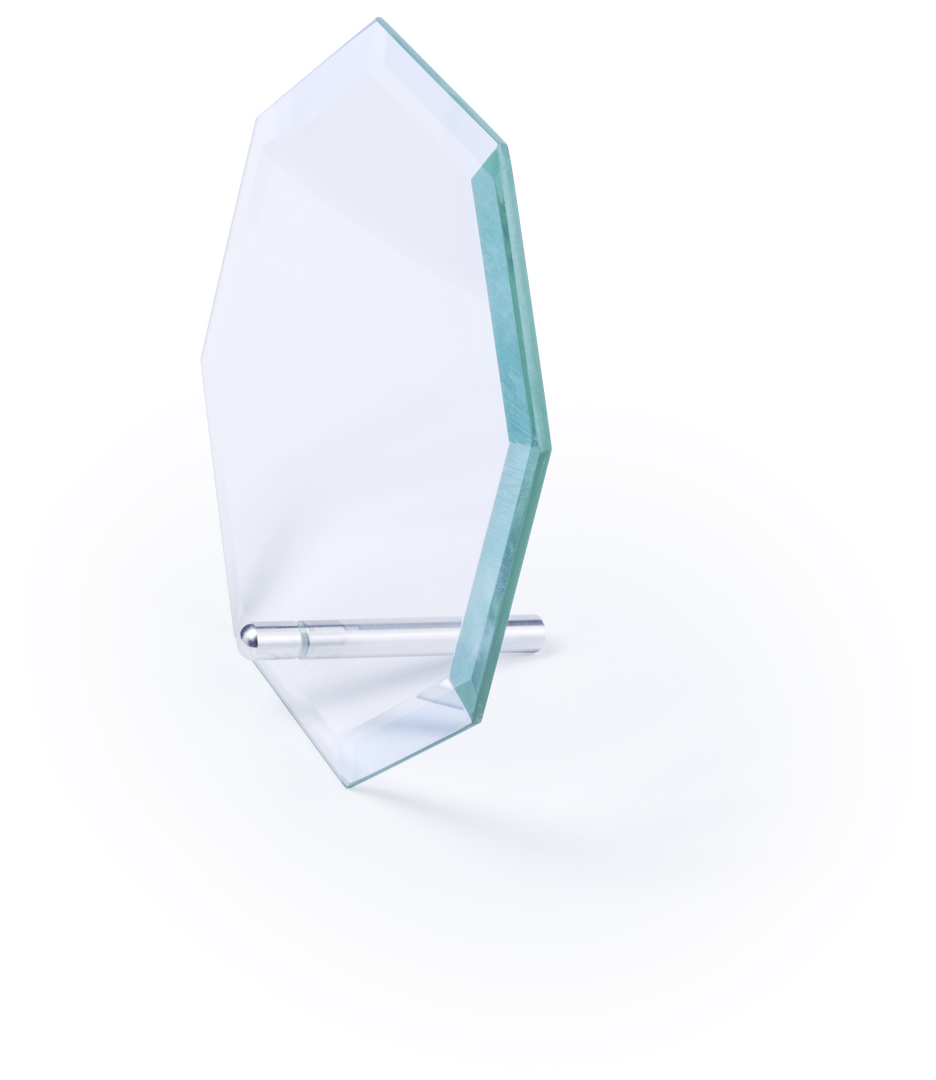 Placa trofeo de grueso cristal con elegante diseño octogonal. Especialmente diseñada para marcaje a láser y presentada en estuche de protección individual.