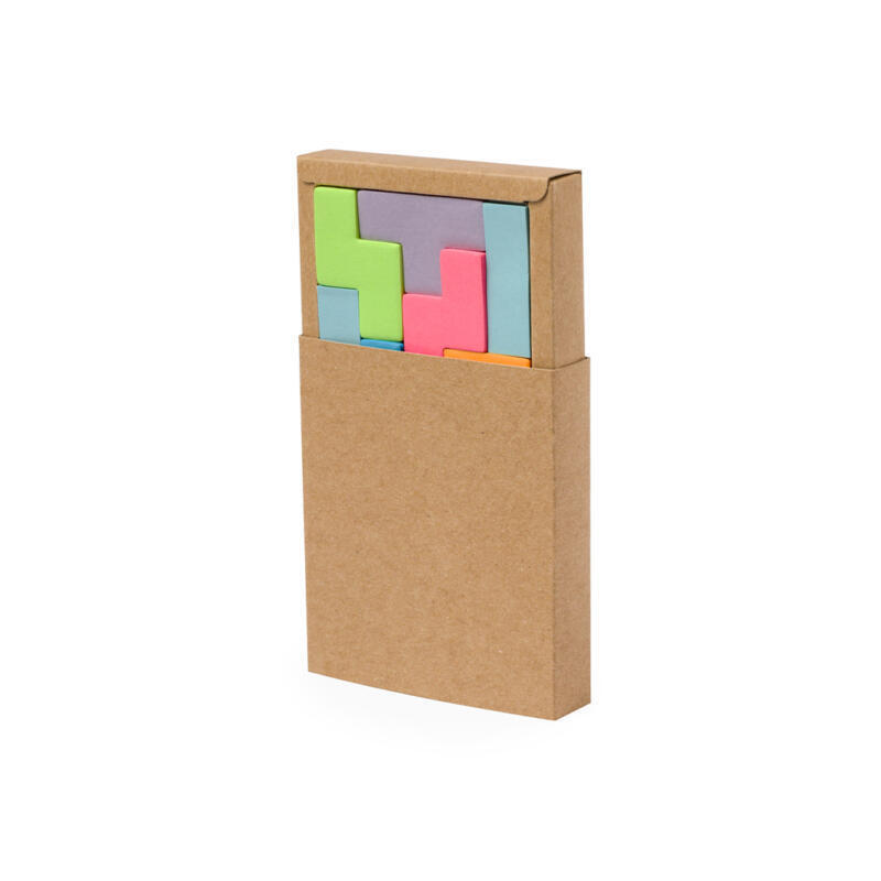 Portanotas fabricado en cartón reciclado. Con 200 mininotas adhesivas en diferentes colores y formas geométricas. Presentados en una caja de cartón reciclado con funda.