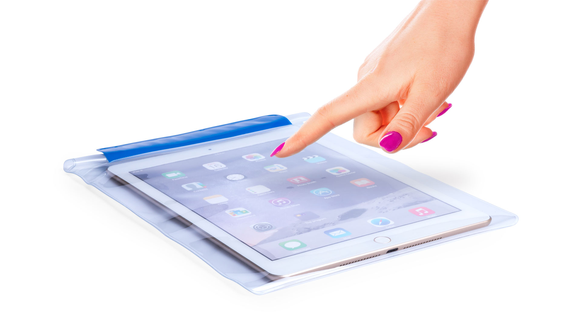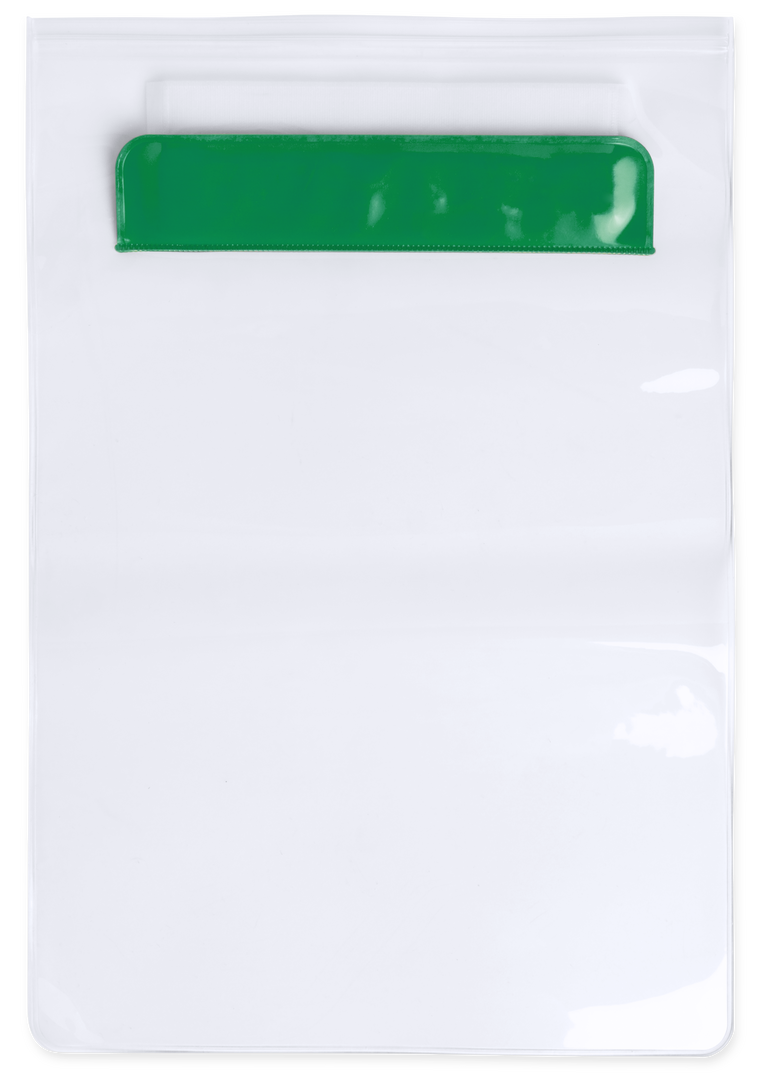 Práctico portatodo impermeable en PVC con función táctil, diseñado especialmente para tablets de hasta 9,7 pulgadas y doble sistema de seguridad para preservar la estanqueidad. Con solapa frontal en variada gama de colores.