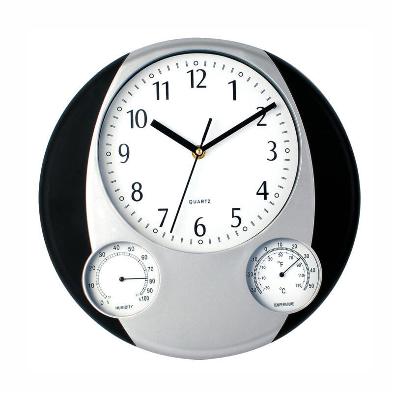 Reloj analógico de pared de diseño circular, con termómetro e higrómetro integrados. Alimentación a pila: tipo AA no incluida y presentado en caja individual.