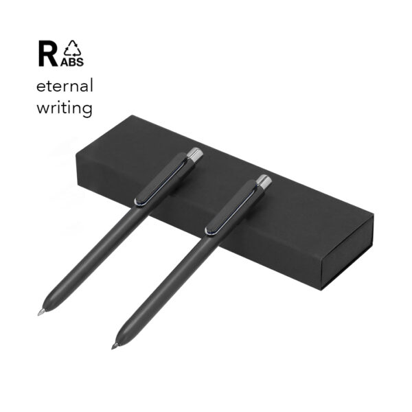 Set compuesto por un bolígrafo de tinta azul y un lápiz eterno, ambos fabricados en RABS. El lápiz eterno ofrece escritura continua, evitando generar residuos, y ambos cuentan con mecanismo pulsador. Diseñados con clip a juego y detalles cromados. Presentados en estuche de cartón reciclado de color negro. Con distintivo de RABS impreso.