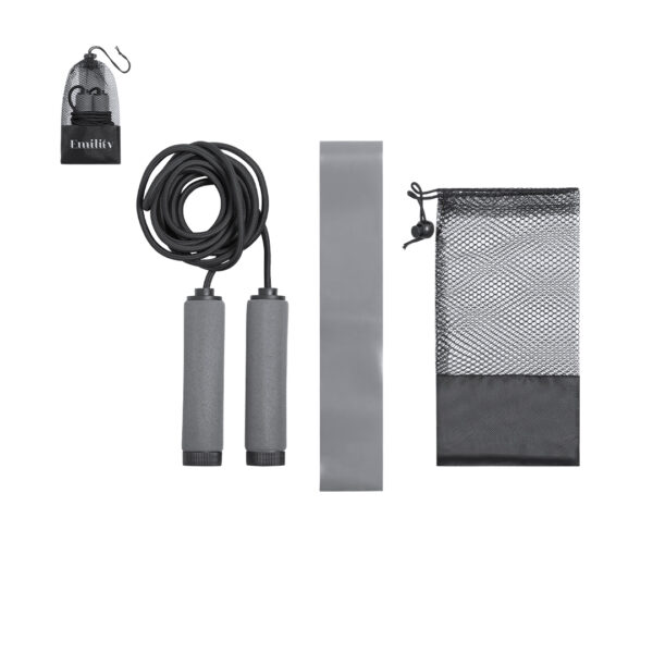 Set de goma elástica y comba para los más deportistas. Incluye: 1 cinta de 25×5 cm fabricada en resistente material TPE y resistencia media 1 comba de 260 cm, con mangos en resistente material HIPS forrados en EVA. Presentado en funda de poliéster con cierre de cordón y accesorio de ajuste.