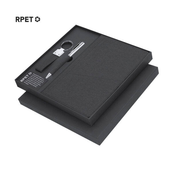 Elegante set premium que incluye:Bloc de notas en RPET en elegante color negro. Incluye cierre elástico, bolsillo frontal y marcapáginas de tela. Interior con 80 hojas de disposición a una raya. Bolígrafo en RPET de acabado negro mate, de mecanismo giratorio y tinta azul. Con clip y puntera en pulido metal.Elegante llavero con cinta fabricada en poliéster RPET 300D y accesorios cromados.Set presentado en estuche individual de acabado mate, con troquelado interior para cada uno de los elementos del set y tarjeta de RPET en el interior.El material RPET se elabora a partir de plástico reciclado, para así fomentar la reutilización de residuos plásticos y ayudar a la sostenibilidad del planeta.