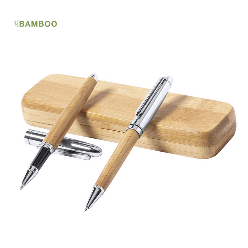 Set de bolígrafo y roller de línea nature. Fabricado en combinación de bambú con metal, para así fomentar la utilización de materias primas naturales y reducir las emisiones contaminantes. Bolígrafo de mecanismo giratorio en tinta azul. Roller con capucha, tinta gel en azul y carga jumbo. Presentado en estuche individual de bambú.