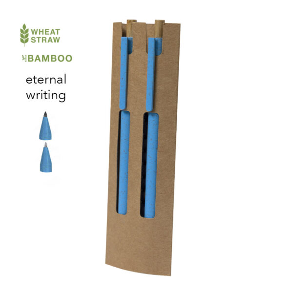 Set de bolígrafo y lápiz eterno fabricados en caña de trigo y bambú. Bolígrafo con mecanismo pulsador fabricado en bambú de tinta azul y clip a juego. Y lápiz con mecanismo pulsador fabricado en bambú con punta eterna, para así usar siempre el mismo lápiz y no generar residuos. Presentados en estuche de cartón reciclado. Con distintivo de caña de trigo impreso.Elaborado con elementos vegetales para así fomentar la utilización de materias primas naturales y reducir las emisiones contaminantes.