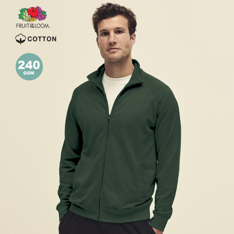 Sudadera para adulto Lightweight Sweat Jacket de Fruit Of The Loom. Fabricada en felpa ligera sin cepillar, en combinación de materiales 80% algodón + 20% poliéster de 240g/m2. Con cierre de cremallera a juego, mangas de ranglán y 2 bolsillos delanteros. Cintura y puños en algodón/ LYCRA. Disponible en variada gama de colores y en tallas S, M, L, XL, XXL.