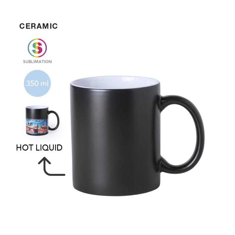 Taza de cerámica de 350ml de capacidad con exterior en color negro e interior en blanco. Especialmente diseñada para marcaje en sublimación. Presentada en caja individual.Disponible manual de instrucciones en español e inglés.