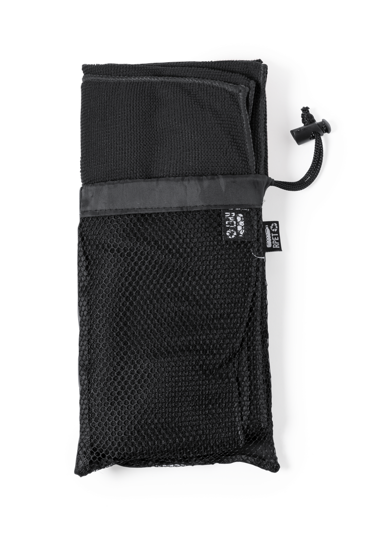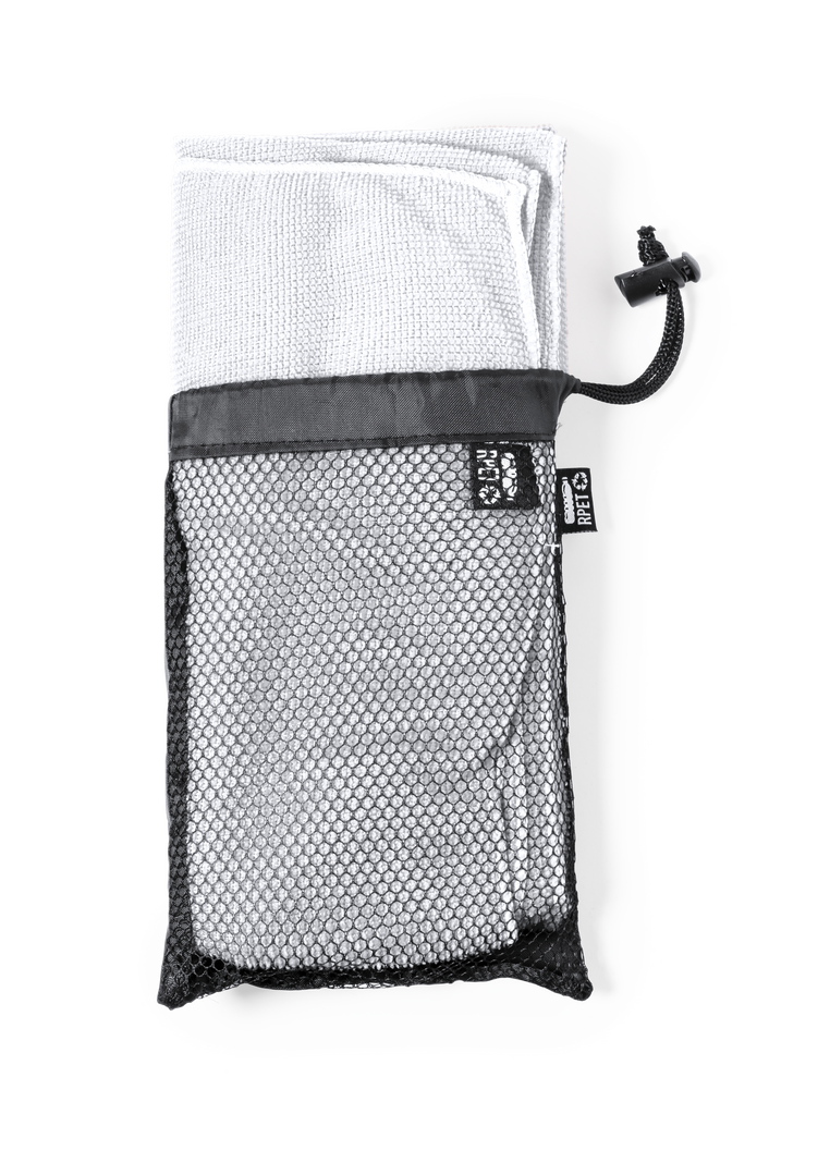 Toalla absorbente de línea nature. Fabricada en RPET de 160g/m2, elaborado a partir de plástico reciclado para así fomentar la reutilización de residuos plásticos y contribuir a la sostenibilidad del planeta. Tamaño 50×100 cm, presentada en funda individual de redecilla RPET con parte trasera lisa y disponible en variada gama de colores. Con distintivo RPET en etiqueta.