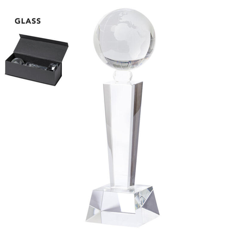 Trofeo de grueso cristal con diseño mundo y resistente base. Especialmente diseñado para marcaje a láser y presentado en estuche de protección en resistente cartón y cierre magnético, con interior troquelado en espuma.