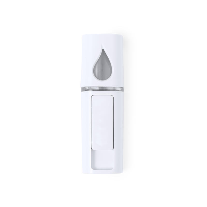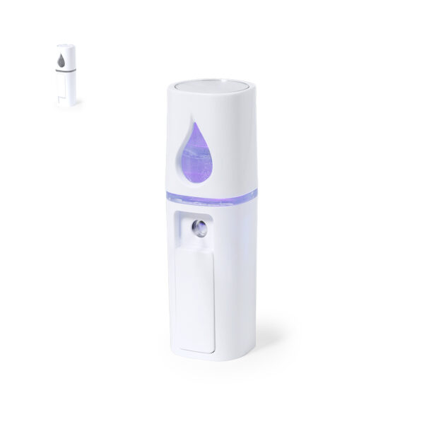 Fantástico vaporizador de bolsillo. Refrescante e hidratante pulverizador eléctrico crea una ligera bruma para rociar sobre la piel deslizando la tapadera protectora. Contenedor de 15 ml recargable con tapón de rosca, indicador de nivel y elegante luz morada. Con espejo en la tapadera. Funciona con batería de 250 mAh, cable incluido. Presentado en una caja individual.