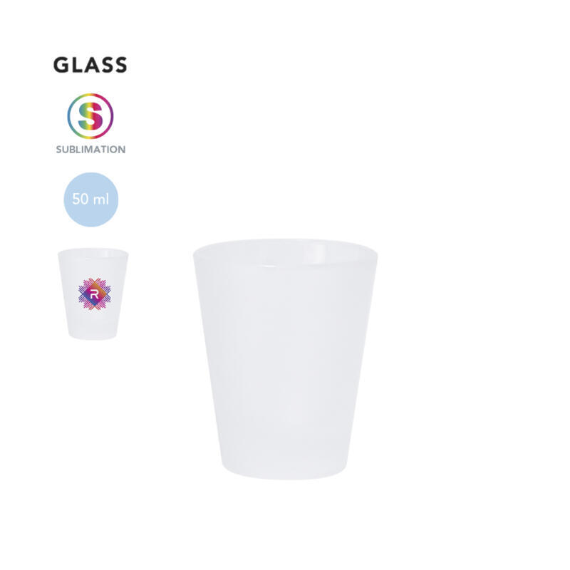 Vaso de chupito de 50 ml de capacidad en resistente cristal de acabado frosted. Especialmente diseñado para marcaje en sublimación.