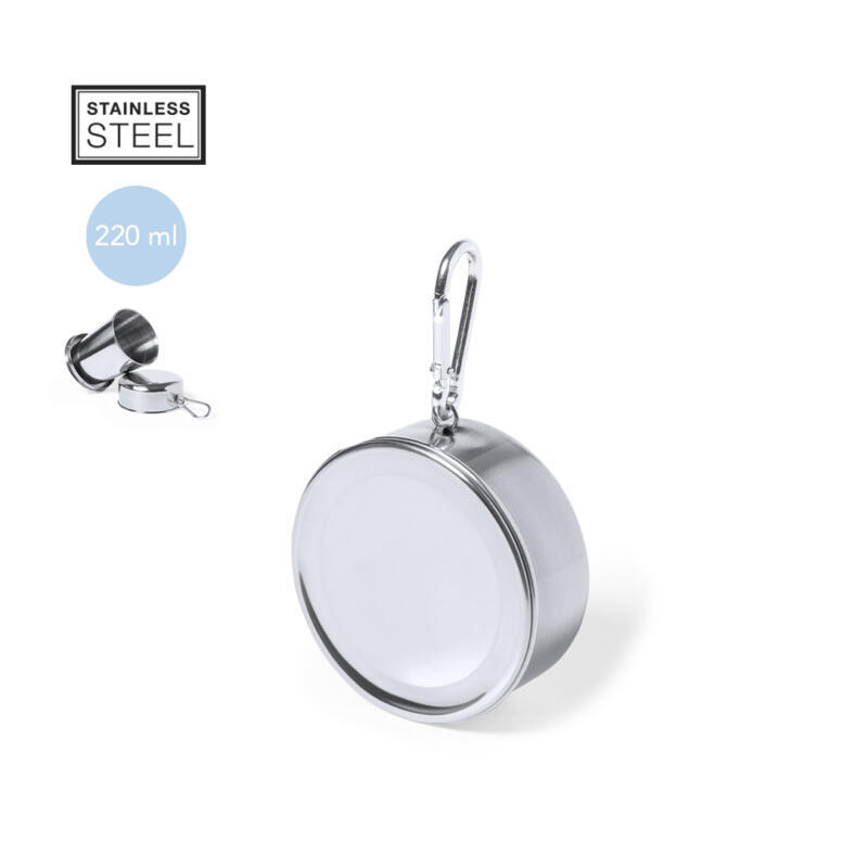 Original vaso plegable para emergencias fabricado en acero inox. De 220ml de capacidad y con mosquetón metálico de transporte.