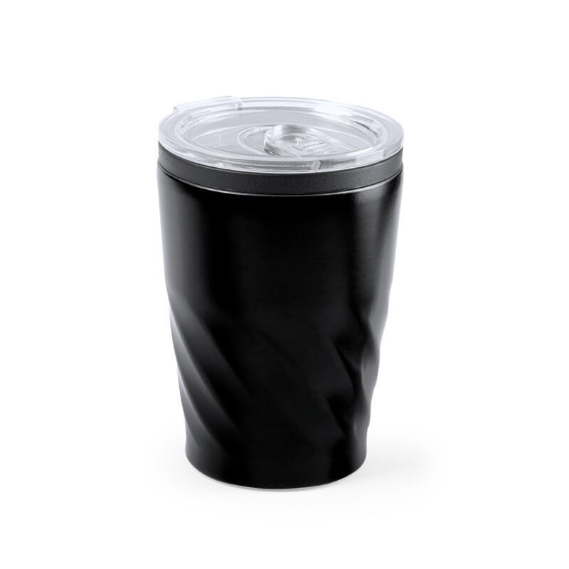 Vaso fabricado en acero inox de 350ml de capacidad. Cuerpo con diseño biselado, con anilla de color negro. Con original tapón dosificador transparente y abrefácil. Es ideal para tener en tu escritorio, mesa o en cualquier superficie donde disfrutar tranquilamente de tu bebida favorita.