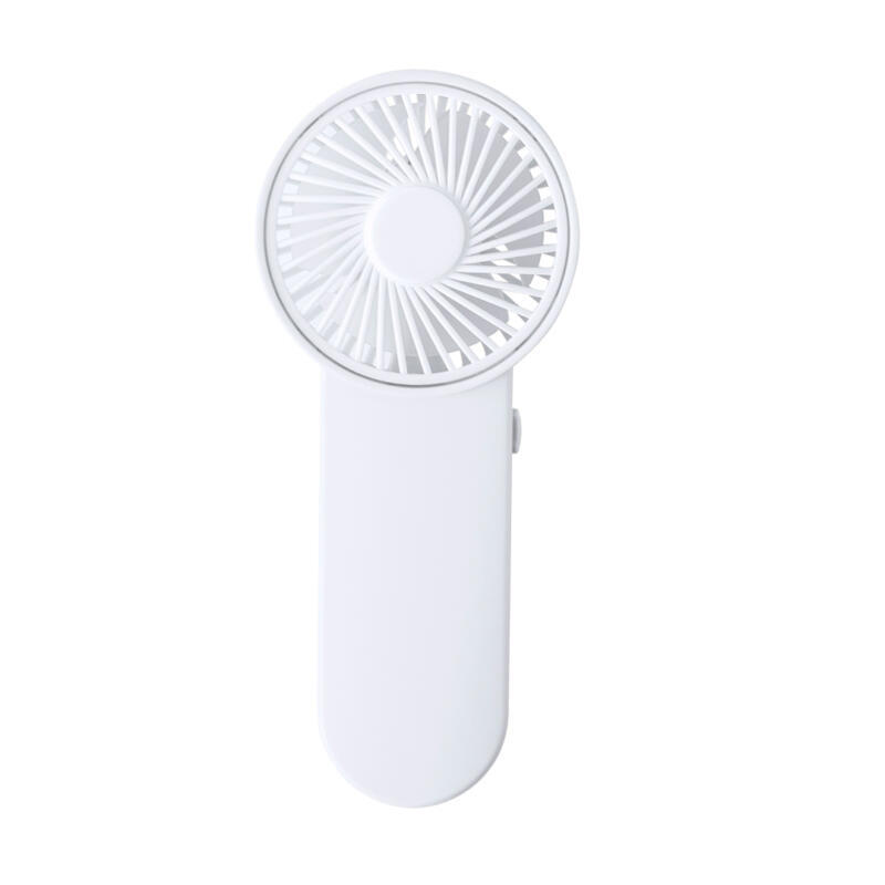 Ventilador de mano en resistente ABS. Con botón lateral de on/off y disponible en variada gama de vivos colores. Alimentación a pilas -2xAA no incluidas. Presentado individualmente en caja.